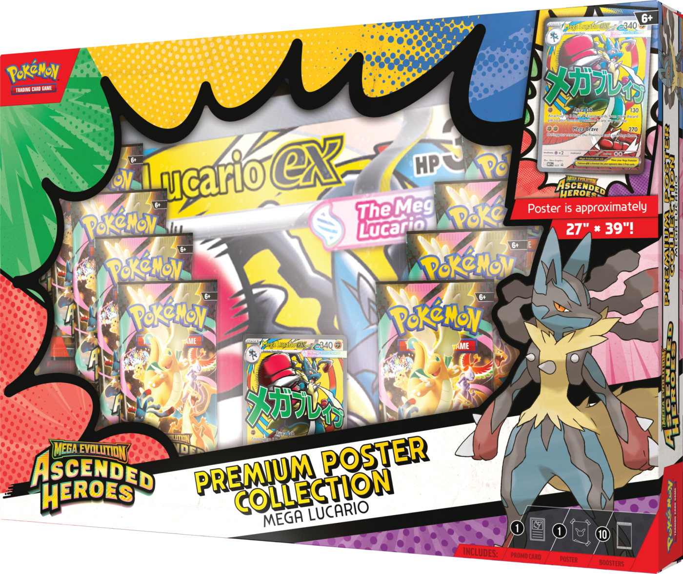 Dzięki potężnym atakom i wysokiemu HP Mega Lucario ex oraz Mega Gardevoir ex przełamują wszelkie granice w walce! Połącz siły z jednym z tych potężnych Mega Evolution Pokémon ex dzięki kartom w wariancie full-art foil oraz boosterom z dodatku Mega Evolution – Ascended Heroes. W zestawie znajdziesz także duży plakat przedstawiający Mega Lucario lub Mega Gardevoir oraz inne Pokémony pojawiające się w tym wyjątkowym rozszerzeniu.